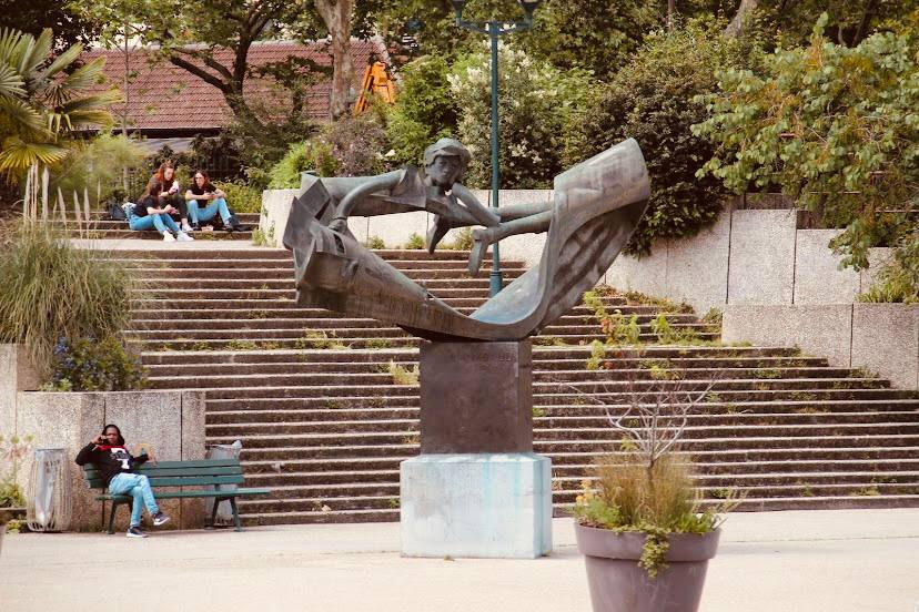 یکی از تندیسها در این مجموعه، بیش از بقیه، توجهم را جلب کرد: تندیس «مردی با کفپا در جلو [L’Homme aux semelles devant]، و اثر «ژان ایپوستگوی» [Jean-Robert Ipoustéguy] مجسمهساز معاصر فرانسوی،-درگذشته به سال ۲۰۰۶- است که بازآفرینی «آرتور رمبو» [Arthur Rimbaud] و نکوداشت این شاعر شوریدهحال به شمار میرود. این اثر، که در سال ۱۹۸۵ ساخته شده، پیشتر مقابل «کتابخانۀ آرسنال» در محلۀ چهارم پاریس قرار داشت و از پاییز ۲۰۱۸ به مکان فعلی منتقل شده است.