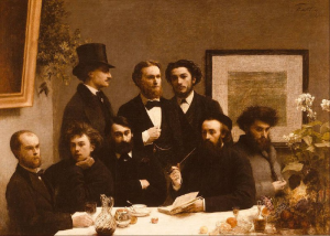 [۶] این نقاشی مشهور آنری فانتن لاتور، سومین اثر از چهار تابلویی است که او از نویسندگان و شاعران فرانسوی، در سال ۱۸۷۲ کار کرده بود. داستان این تابلو نیز جالب توجه است: فانتن به مناسبت پنجاهمین سالگرد تولد بودلر- شاعر نوپرداز و مهم فرانسه- از شعرا و نویسندگانی مانند «پل ورلن» و «امیل بلمونت [Émile Blémont] » و البته آرتور رمبو که به نوعی مشابه ادبی بودلر و علاقهمند به مجموعۀ شعر «گلهای رنج [Les Fleurs du mal] » او محسوب میشدند، دعوت کرد تا در یک مهمانی حاضر باشند تا او از ژستهای آنها طرح بزند.گویا از ویکتور هوگو هم دعوت شد که نپذیرفت. البته رمبو، علیرغم شیفتگی به بودلر، چنانکه در «نامۀ غیببین» آورده، خود را تالی او نمیدانست و معتقد بود: «بودلر، بیش از اندازه آگاهی هنری دارد.» تابلوی «یک گوشه از میز»، امروزه در «موزه اُرسی» پاریس در معرض تماشا قرار دارد.