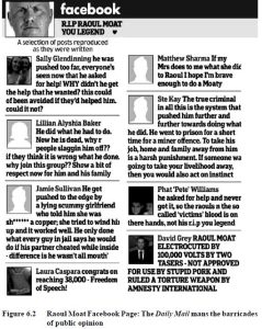 جالب اینجاست که رسانههای جناح راست، پویایی طبقاتی موجود در پسِ «موج» غیرقانونی همدردی [به تعبیر] کامرون را آشکار کردند. در اسکای نیوز[۷]، یک جرمشناس از ضربه موت به «ذهنیت مردانه طبقه کارگرِ محرومِ سفیدپوست» سخن گفت. روزنامه دیلی میل[۸] که از خشم به خروش آمده بود، قادر نبود ساختار احساسی پسِ پیامهای باقیمانده در صفحه «در آرامش بخواب، رائول موت، تو اسطورهای» را عیان کند. سایت فیسبوک حتی آنها را محکوم و رد کرد. در مقالهای تحت عنوان «فریاد خشم طبقه محروم دردمند و فریبخورده» که توسط دیوید ویلسون[۹] نوشته شد، این موضوع مطرح شد: