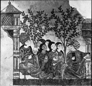 اکنون شواهدی از صحنه پردازیهای موسیقی در فضای باغهای گذشته در دست است که از راه مطالعه آنان میتوان به واقعیتهای تاریخی پی برد. توصیف اجرای موسیقی در دست نوشتههایی مانند رسالهها و مقالات در نسخههای خطی عربی سده سیزدهم در اندلس موجود است که میتوان به داستانهای عاشقانه(بیاض و ریاض) در کنار موسیقی اشاره میکنند. یکی از این رسالهها مربوط به داستان عشق بیاض[iv]، تاجر جوان دمشقی بر یک کنیز است که چندین تصویر از صحنههای آن در یک باغ اتفاق افتاده است. در این صحنه خوانندهها و عودنوازان به اجرای موسیقی میپردازند. داستان از اینجا آغاز میشود که در یک گردهمایی در باغی که زنان متعددی در آن حضور دارند، با دختر حاجب (نخست وزیر)[v] آشنا میشود.