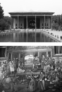 تصویر اجرای موسیقی را در مقیاس بزرگتر در نقاشیهای دیواری کاخها هم نشان داده شده است. یک نمونه کامل از اجرای برنامه موسیقی را میتوان در کاخ چهلستون[viii] در مجموعه کاخهای صفویه در اصفهان مشاهده نمود. چهلستون باغی بزرگ با درختان و گلزار و کانال آبروفت مستطیلی شکل همراه با غرفهها و ایوانهای متعدد با ستونهای چوبی و ایوانهای طاق دار بزرگ در محیطی سرسبز بنا شده است. بر روی دیوارهای تالار چهار نقاشی دیواری بزرگ در سالن پذیرایی دیده میشود که تصویر نبردهای تاریخی را توصیف میکند. بر روی دیوار کوچکتر، صحنههای جشن را توصیف میکند. تصویرهایی که بر روی ایوانهای کنار باغ کشیده شدهاند، آراسته به تصاویر شاه، درباریان،بازدیدکنندگان و امورسرگرمی و همچنین تصویر افرادی که در جشنها بیننده و شنونده بودهاند، به چشم میخورد.