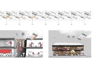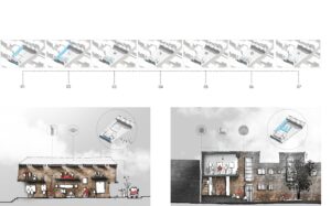 یکی دیگر از فضاهای جذابی که در این طراحی در نظر گرفته شد یک فضای گالری برای نمایش آثار دانشآموزان بود. این گالری در ضلع شمالی سایت و در کنار ساختمان شمالی طراحی شد که از بیرون مدرسه هم ورودی دارد و افراد محله و علاقهمندان به آثار دانشآموزان میتوانند از این گالری دیدن کنند.