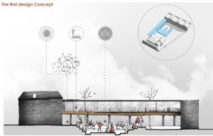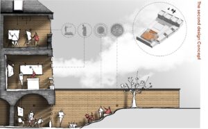 یکی از این نیازها که اغلب فارغ التحصیلهای سابق به آن اشاره میکردند فضایی برای تعامل و گفتگو به همراه سرو قهوه برای دانشآموزان بود. پاسخ به این نیاز از طریق ایجاد فضای تعاملی و گفتگو از با تغییر سطوح حیاط و ایجاد سکوها در آن داده شد. در واقع این طرح یک نگاه خلاق جهت استفاده از حیاط موجود باست که با کافهای در ساختمان شمالی مرتبط میشود و فضایی بسیار سرزنده را به وجود میآورد. یکی دیگر از نیازها وجود یک فضا برای نمایش کارهای آخر ترم دانشآموزان بود که یک فضای ضروری به نظر میرسید. این فضا در ضلع شمالی سایت و در ارتباط با ساختمان موجود طراحی شد.