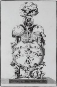 [۱۰] این تصویر حکاکی نمادین مرتبط با کیمیاگری است. روی پایه، جملهای به زبان لاتین (Paradigma Operis Philosophici ) حک شده که به «نمونهای از اثر فلسفی» ترجمه میشود. تصویر، گلدان یا جام بزرگی را نشان میدهد که نمادهای کیمیاگری و فلسفی روی آن به چشم میخورد. عناصر تصویری شامل شخصیتهای اسطورهای، نمادهای خورشیدی و قمری، حیوانات، آتش و ققنوسی در حال برخاستن از دود است که نشاندهنده تحول و دگردیسی است. این تصویر بازتابی از مراحل مختلف کیمیاگری و مفهوم «اثر بزرگ(Magnum Opus)» است که هدف نهایی کیمیاگران یعنی دگرگونی ماده و دستیابی به سنگ فلسفی را نشان میدهد. «– م»
