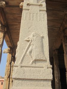 کنده کاری بر روی ستون معبد هزار راما نشان دهنده مردی با سپری بلند منطقه باستانی هامپی ایالت کارناتاکا جنوب هند