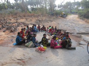 زنان روستایی در منطقه باستانی هامپی در حال خوردن ناهار