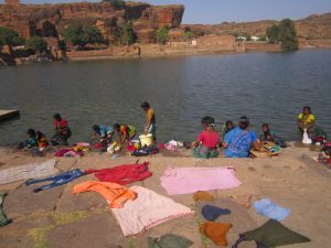 مردم شهر بادامی در حال رختشویی در دریاچه جلوی غار معابد بادامی