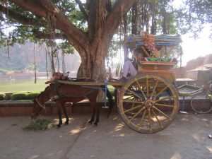 درشکه کهنه ای که گردشگران را در محوطه غار معابد بادامی می چرخاند