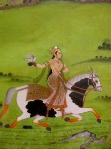 دیگر مینیاتور از چاند بی بی Chand Bibi زنی شجاع و جنگجو که در برابر لشکر جلال الدین اکبر شاه گورگانی با قدرت تمام جنگید , بود این زن همسر علی عادل شاه دوم و محبوب ترین همسر او محسوب می شد این مینیاتور او را در حال اسب سواری و شکار نشان می داد با یک دست مهار اسب را گرفته و در دست دیگرش بازی شکاری دیده می شد شلوار قهوه ای رنگ نقش داری پوشیده و کفش هایی بدون پشت دور بسته مانند دم پایی به رنگ قهوه ای که در زبان های هندی و اردو به آن ها موجرا Mujra می گویند و بر طبق نظر محققان هندی از ایران به هند وارد شده بر پا داشت دامنی بلند که از دو بخش تشکیل می شد بر تن داشت بخش زیرین به رنگ آجری و روی آن را حریر سفید گلداری پوشیده بود این پوشاک با کمربندی پارچه ای از زیر بسته شده بود در بخش بالا تنه پیراهن حریر بسیار نازکی با آستین های کوتاه حاشیه دار پوشیده و گردنبندی دو لایه از مروارید و یاقوت به دور گردن پیچیده بود گوشواره هایی در لاله گوش مانند گردنبند بر گوش داشت در بخش بالایی گوش نیز گوشواره ای از مروارید را مانند میخی در آن بخش فرو کرده بود موهای بلندش آزاد و رها بر پشت سرش ریخته و کلاهی به رنگ قهوه ای کم رنگ که با جواهرات نفیس تزیین شده بر سر داشت بر بالای این کلاه زیوری سه شاخه طلایی که بر روی آن مروارید و یاقوت کار گذاشته شده بود دیده می شد و در پایین مینیاتور دو سگ در حال بازی بودند این زن یک تنه در برابر لشکریان اکبر شاه ایستادگی کرد و مانع ورود ایشان به شهرهای بیجاپور و احمد نگر Ahmadnagar شد اما حمید خان یکی از درباریان اشتباها خبری مبنی بر توافقی پنهانی بین چاند بی بی و اکبر شاه را در میان لشکریان چاند بی بی پخش کرد که باعث خشم بسیار ایشان شد افسران ارتش او را متهم به وطن فروشی کرده و چاند بی بی به دست لشکریان خود کشته شد احمد نگر نیز پس از چهار ماه بدست اکبر شاه افتاد این داستان زنی است که شجاعانه زیست و شجاعانه در راه حفظ میهن خویش جان باخت.