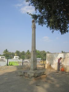 ستونی سنگی جلوی معبد باستانی لیپکشی در شهر هیندوپور با میمونی بالای آن ایالت