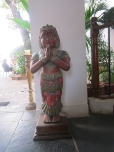 تندیس زنی در پوشاک سنتی ساری و ادای احترام هندی ها ( نمسته) در ورودی هتلی در شهر فرانسوی پوندیچری ایالت تامیل نادو جنوب هند