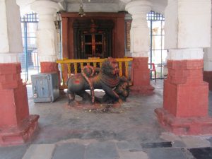 تندیس جنگجویی که با شیر در حال جنگ است در معبد باستانی دورگا دوی در منطقه هامپی
